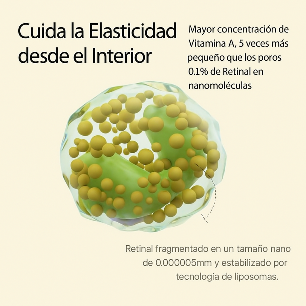 La tecnología avanzada de Retinal en nano-partículas permite que la Vitamina A penetre 5 veces más profundamente que el tamaño de los poros, ofreciendo un cuidado de elasticidad más efectivo desde el interior. Con una concentración de 0.1% de Retinal estabilizado mediante liposomas, ayuda a reafirmar la piel, mejorar la textura y suavizar arrugas para un aspecto visiblemente más joven y saludable.